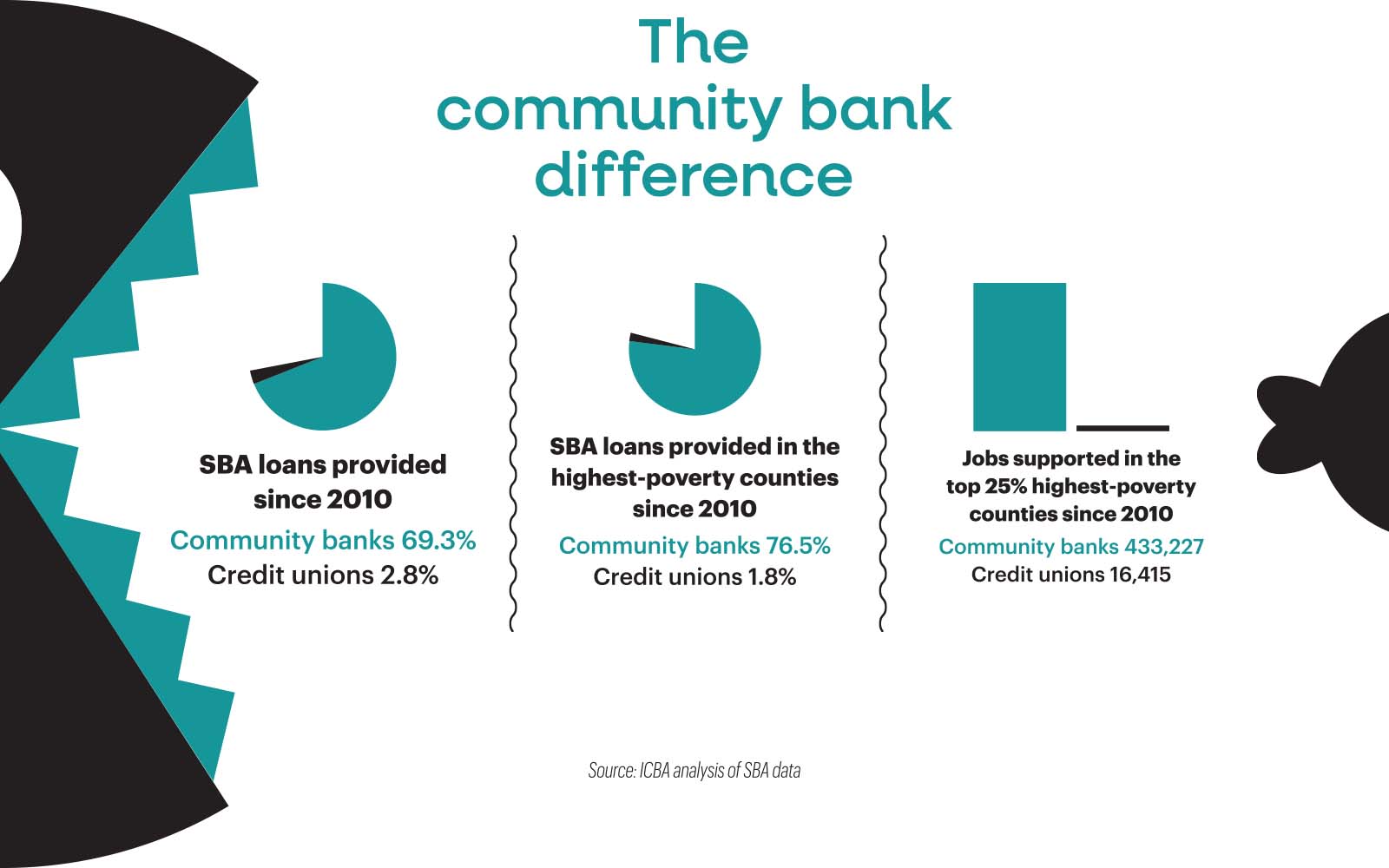 According to ICBA’s analysis, community banks have provided 69.3% of all SBA loan dollars since 2010, compared with just 2.8% from credit unions. In the nation’s highest-poverty counties, community banks delivered more than 76.5% of SBA loans, supporting growth where it’s needed most.